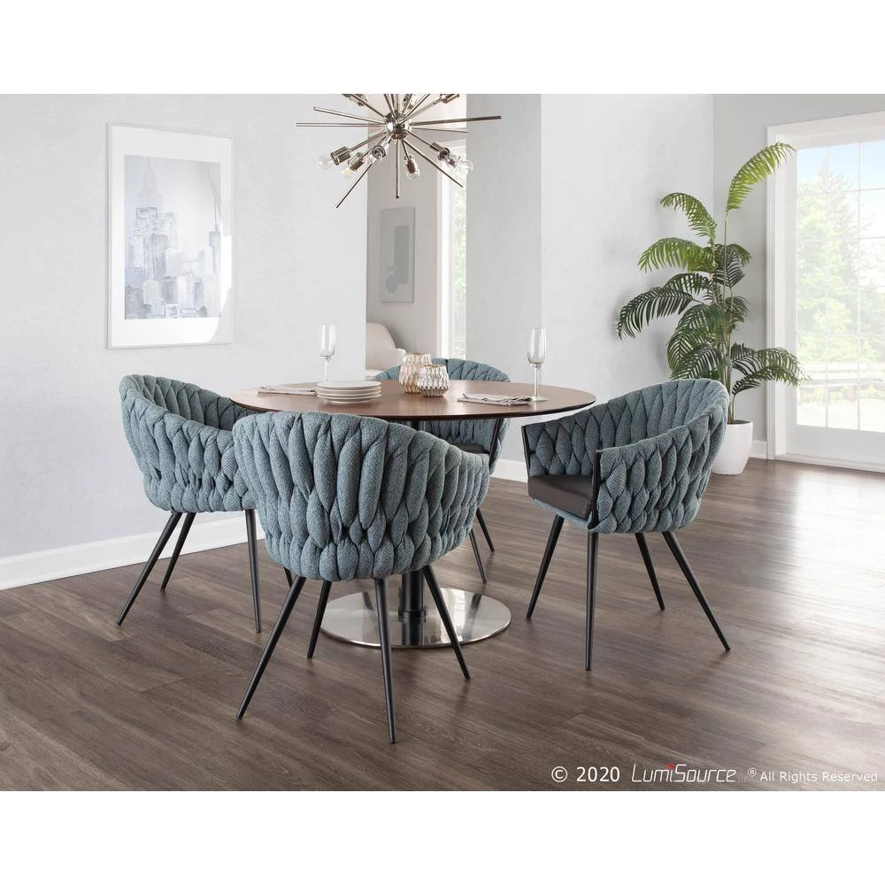 The contemporary design of the Braided Matisse chair features unique braided fabric upholstery, a padded bucket style seat and sleek black metal tapered legs. Use as accent or dining seating, the Matisse comes in a variety of colors. Includes 1-chair.