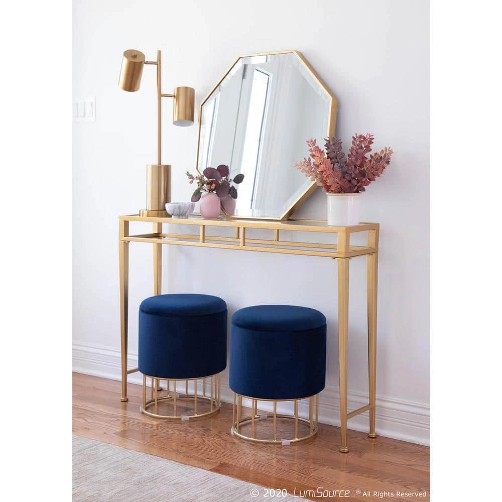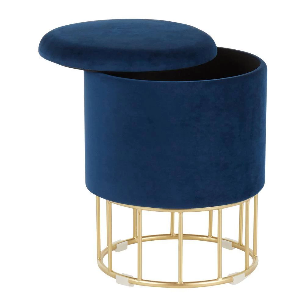 Opulent and confidently contemporary – that’s the Canary Ottoman by LumiSource. Features a captivating cage-like gold-tone metal base and an elegant upholstered top available in various modern colors, a bold touch of fancy for your seating needs. Includes one ottoman.