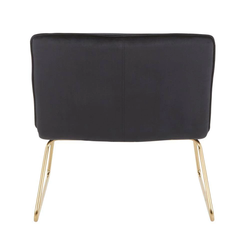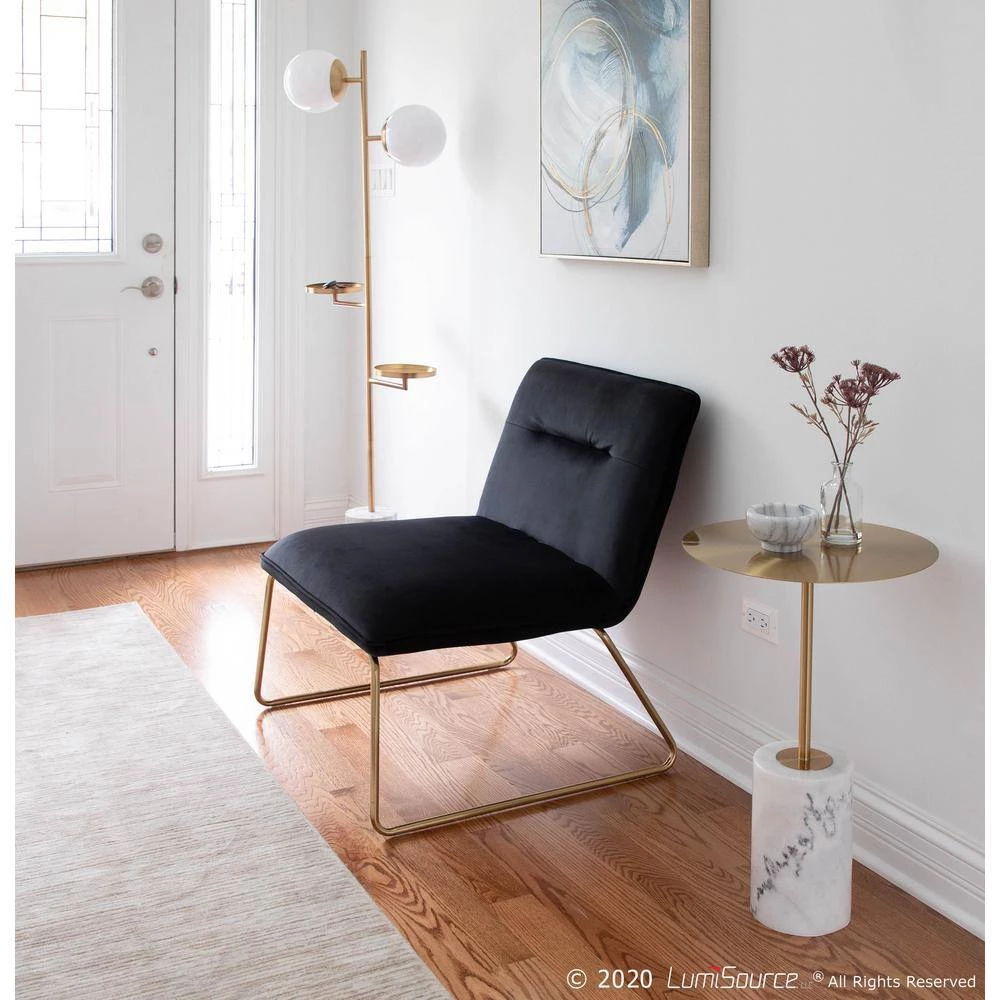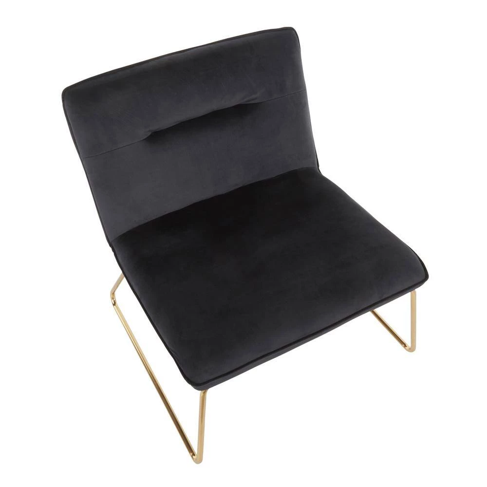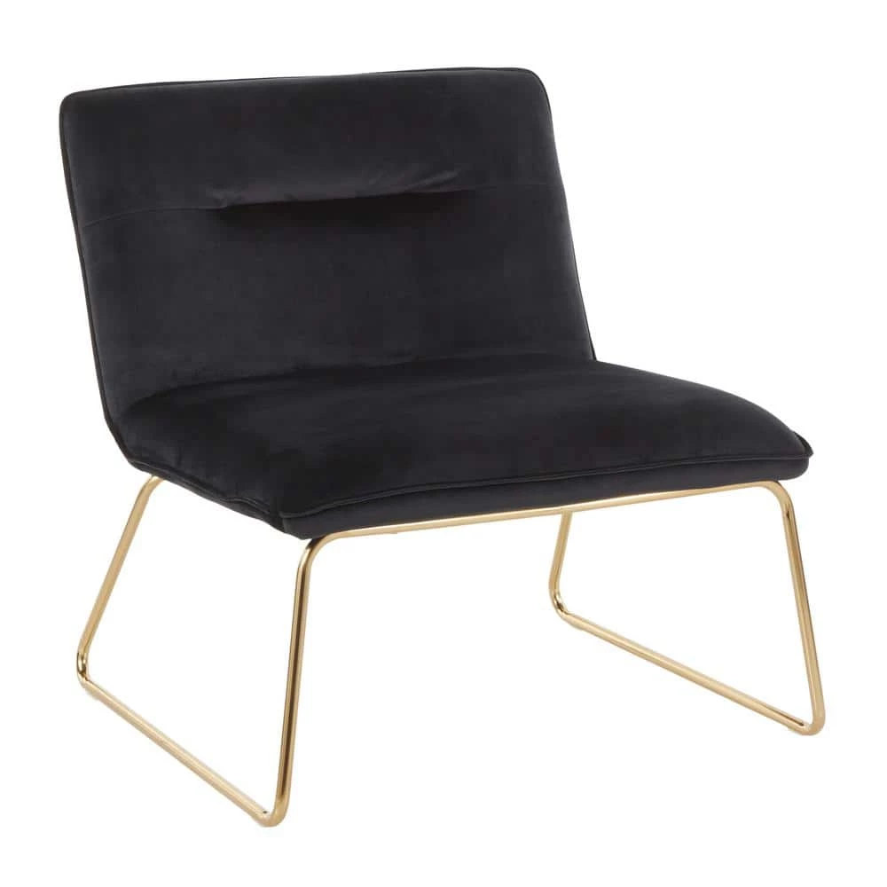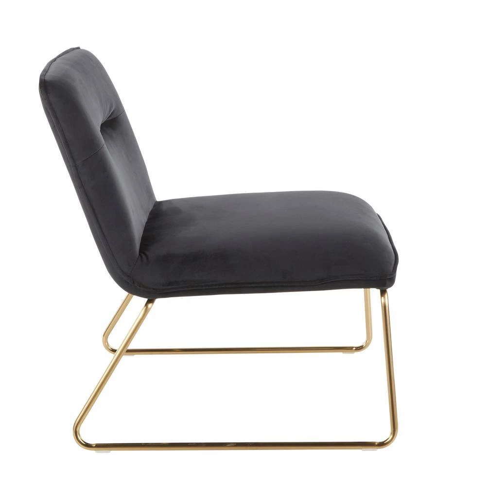 The Casper Accent Chair by LumiSource brings comfortable seating in a stylish and slim design to your home. This chair features a padded seat and back upholstered in sleek velvet fabric. Gold metal sleigh legs provide durable support and contribute to the glam style of the chair. Add as seating to your living room, bedroom or office with this simple yet stylish chair. Available in a variety of upholstery colors, choose the one that fits your space the best.