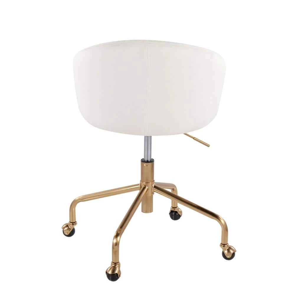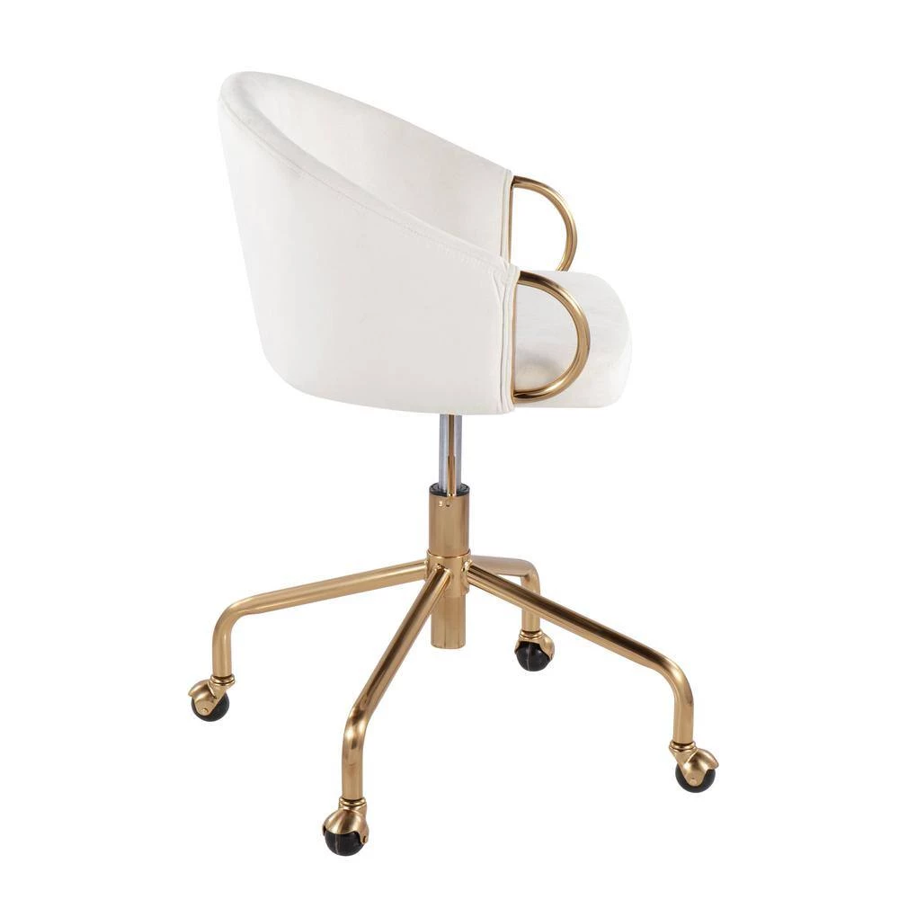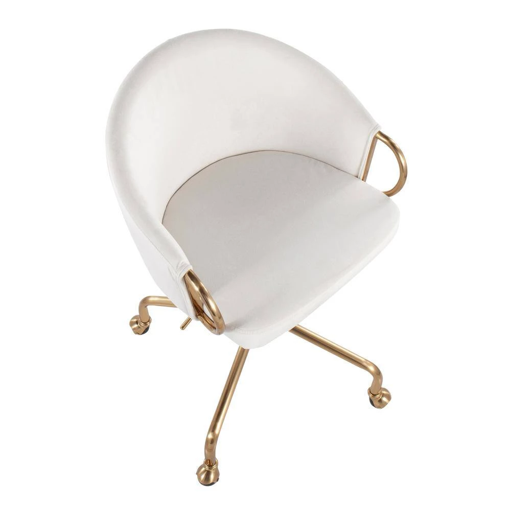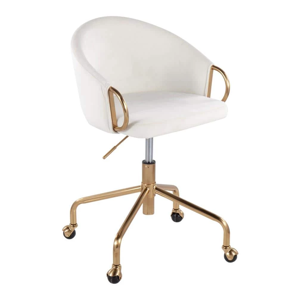 Chic modern style shines bright with the unique design of the Claire Task Chair by LumiSource. The Claire features a low rounded backrest, sleek gold armrests, and a gold metal 4-star base with casters that is adjustable to your preferred height. Upholstered in lush velvet and available in various bold colors.