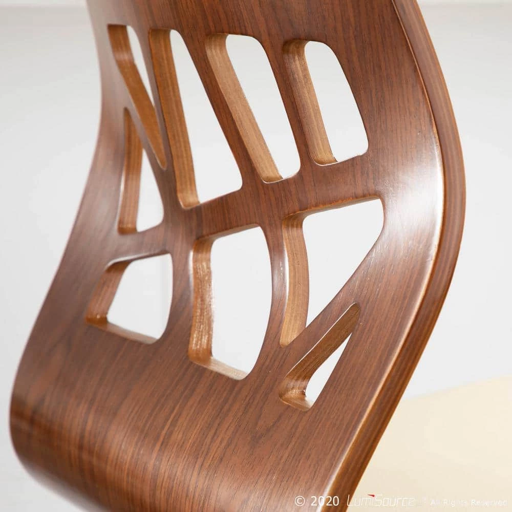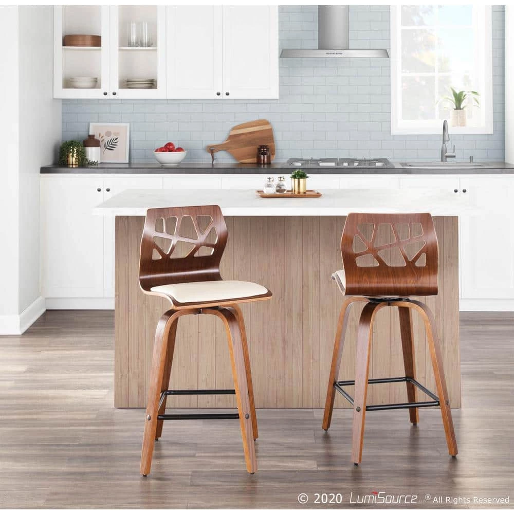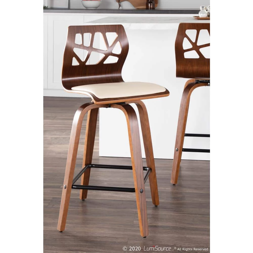 The curved wood frame and cut-out backrest of the Folia Counter Stool will add a touch of style to your counter area. Featuring a stationary wood frame with a natural or walnut finish, a square built-in footrest, and an upholstered padded seat, the Folia Counter Stool is stylish and comfortable. Available in several fabric and color options, choose the one that suits your space best.