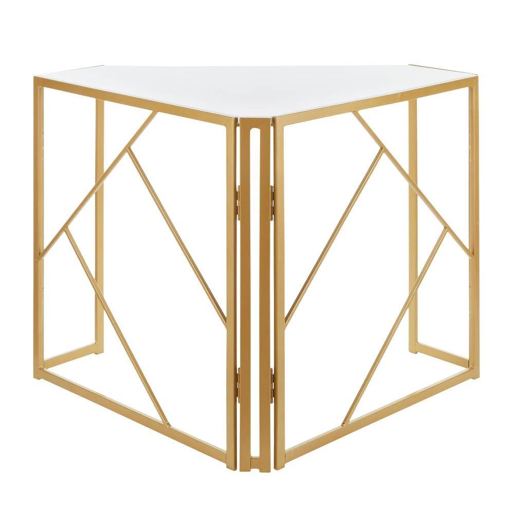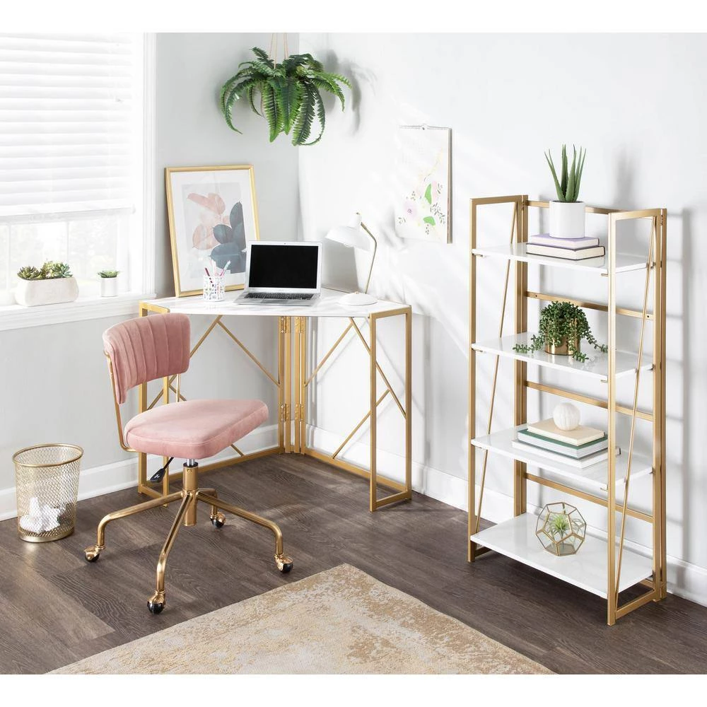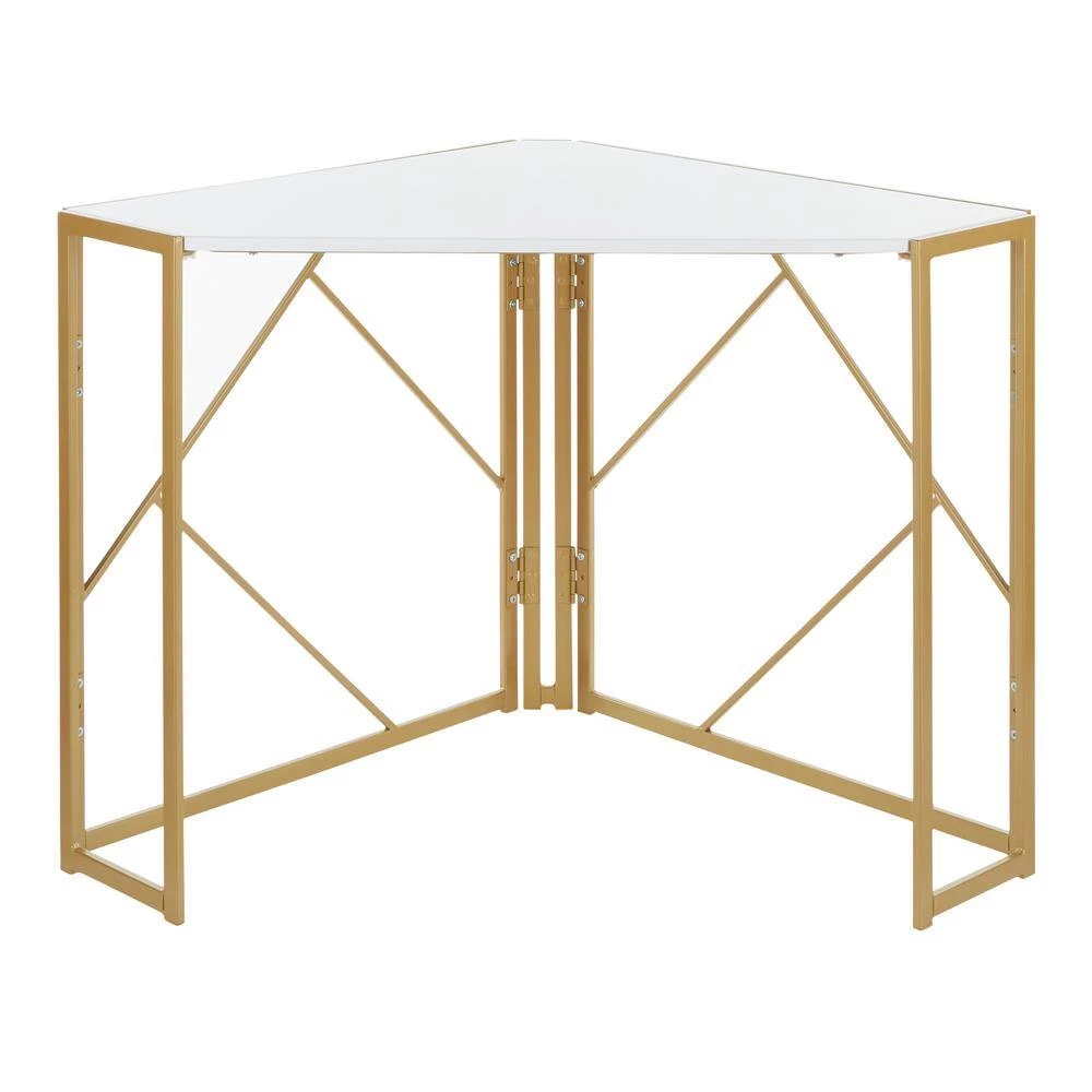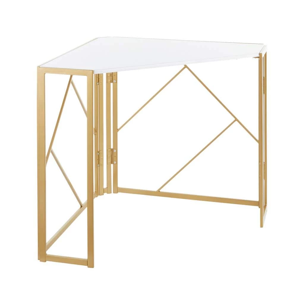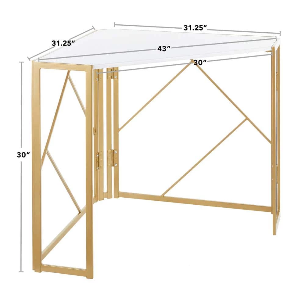 With its pleasant design and modern lines, the Folia Corner Desk by LumiSource is a unique statement in any space. The Folia Corner Desk features a gold metal frame and white wood top, sure to add a touch of glamour to your surroundings. Foldable for easy storage and mobility.