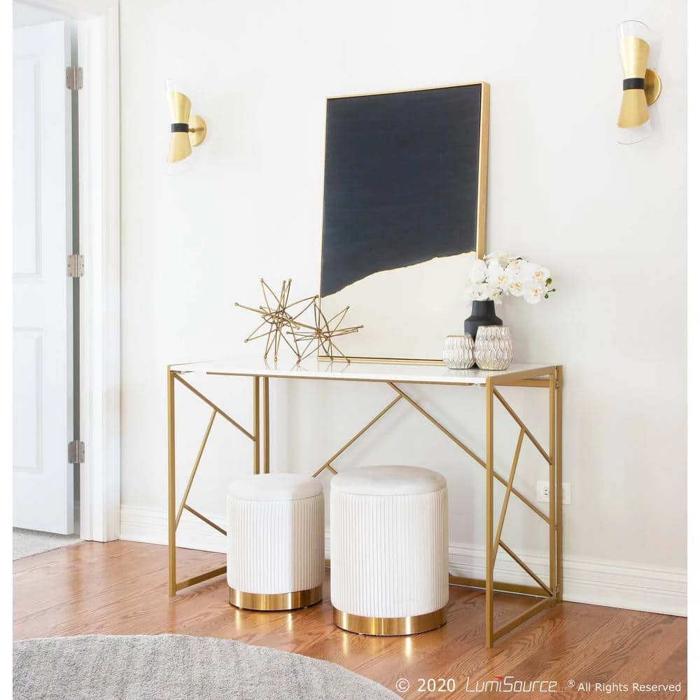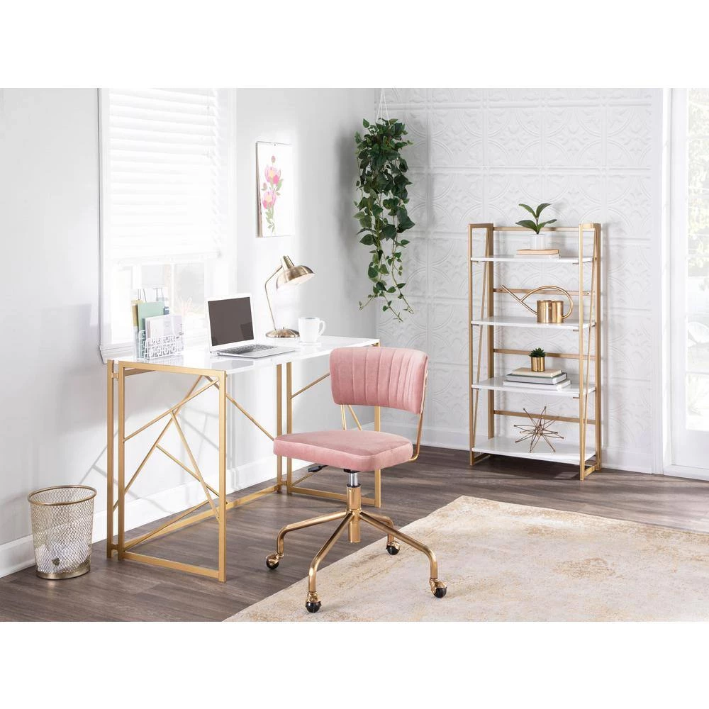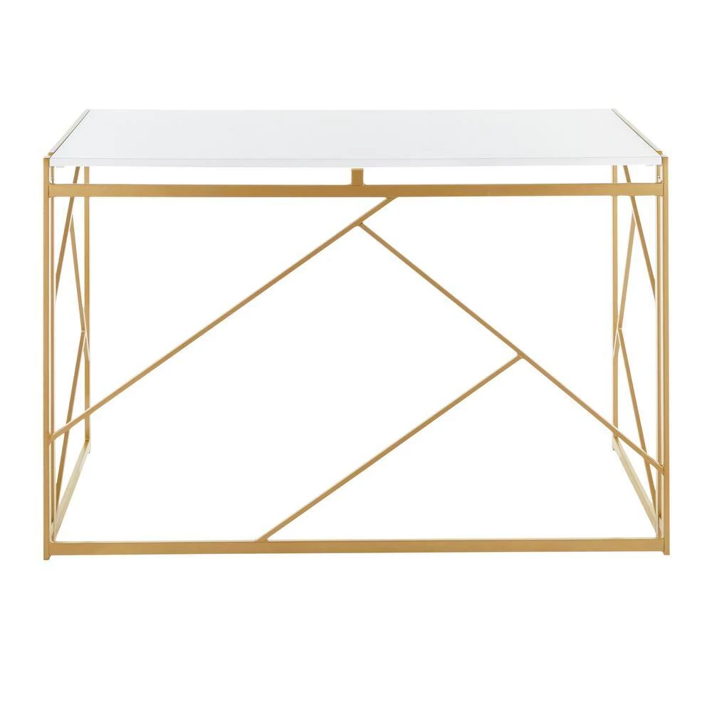 With its pleasant design and modern lines, the Folia Desk by LumiSource is a unique statement in any space. Featuring a gold metal frame and white wood top, the Folia Desk is sure to add a touch of glamour to your surroundings. Includes one desk.