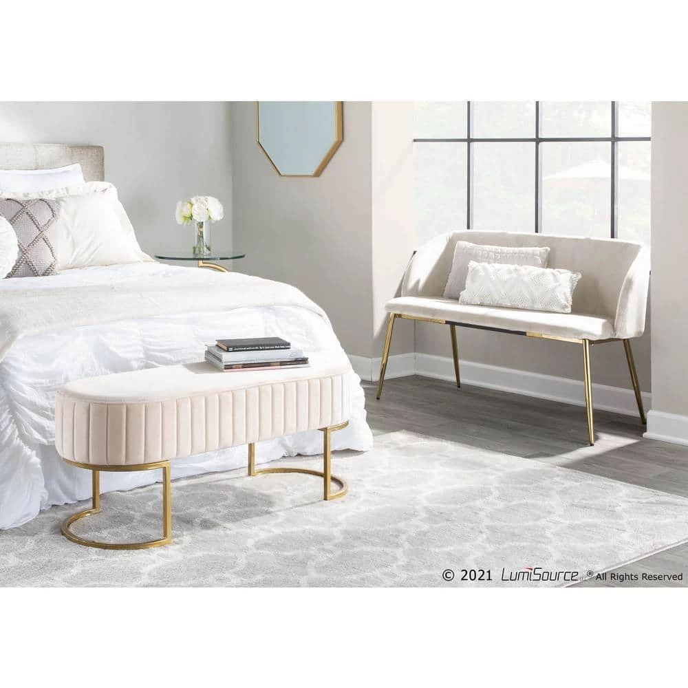 Enrich your bedroom, living room, or entry way with the timeless style of the Fran Bench by Lumisource. Featuring a bucket seat upholstered in velvet and sleek gold metal legs. The Fran Bench is the perfect addition to your home.