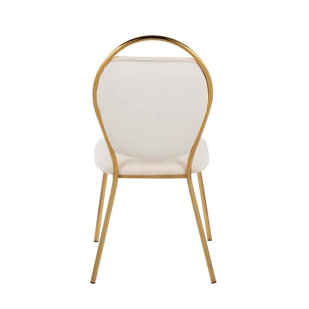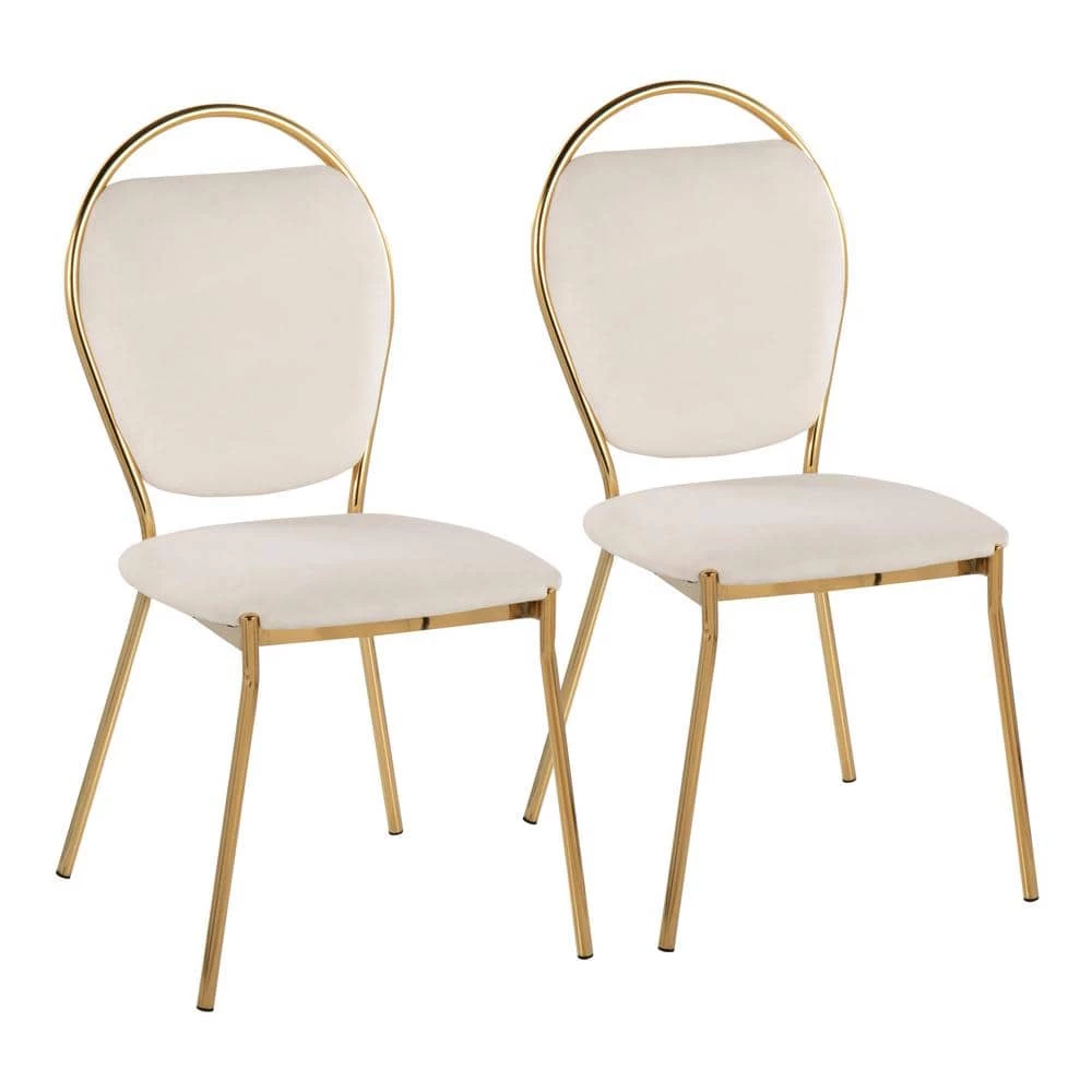 Update your contemporary glam style dining room with the sleek design of the Keyhole Dining Chair by LumiSource. These dining chairs feature a keyhole design with a unique curved metal frame and tapered legs. The gold metal frame of these chairs stands out against the stylish velvet upholstery. Available in a set of two, the Keyhole Dining Chair comes in a variety of upholstery colors