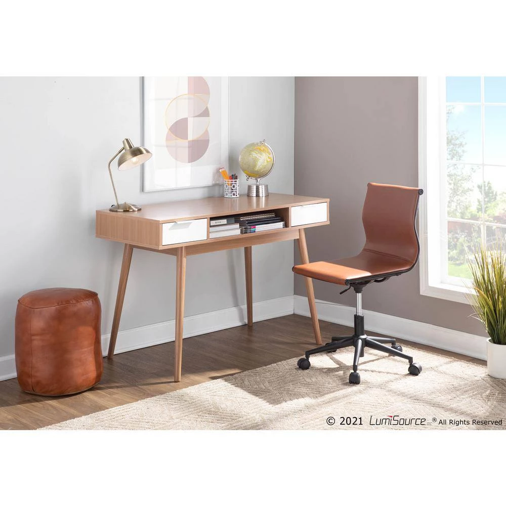 Add casual style to any office space with the Pebble Double Desk by Lumisource. The Pebble Double Desk’s simplistic design is accentuated by a large rectangular wood top, 2-drawers, and an open shelf, perfect for storing all of your supplies. Includes 1 desk.