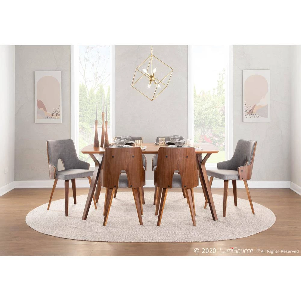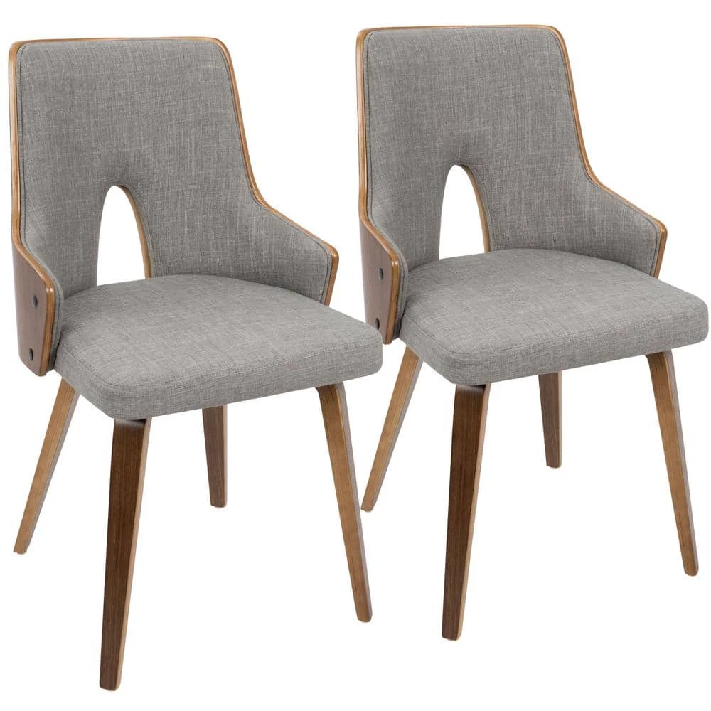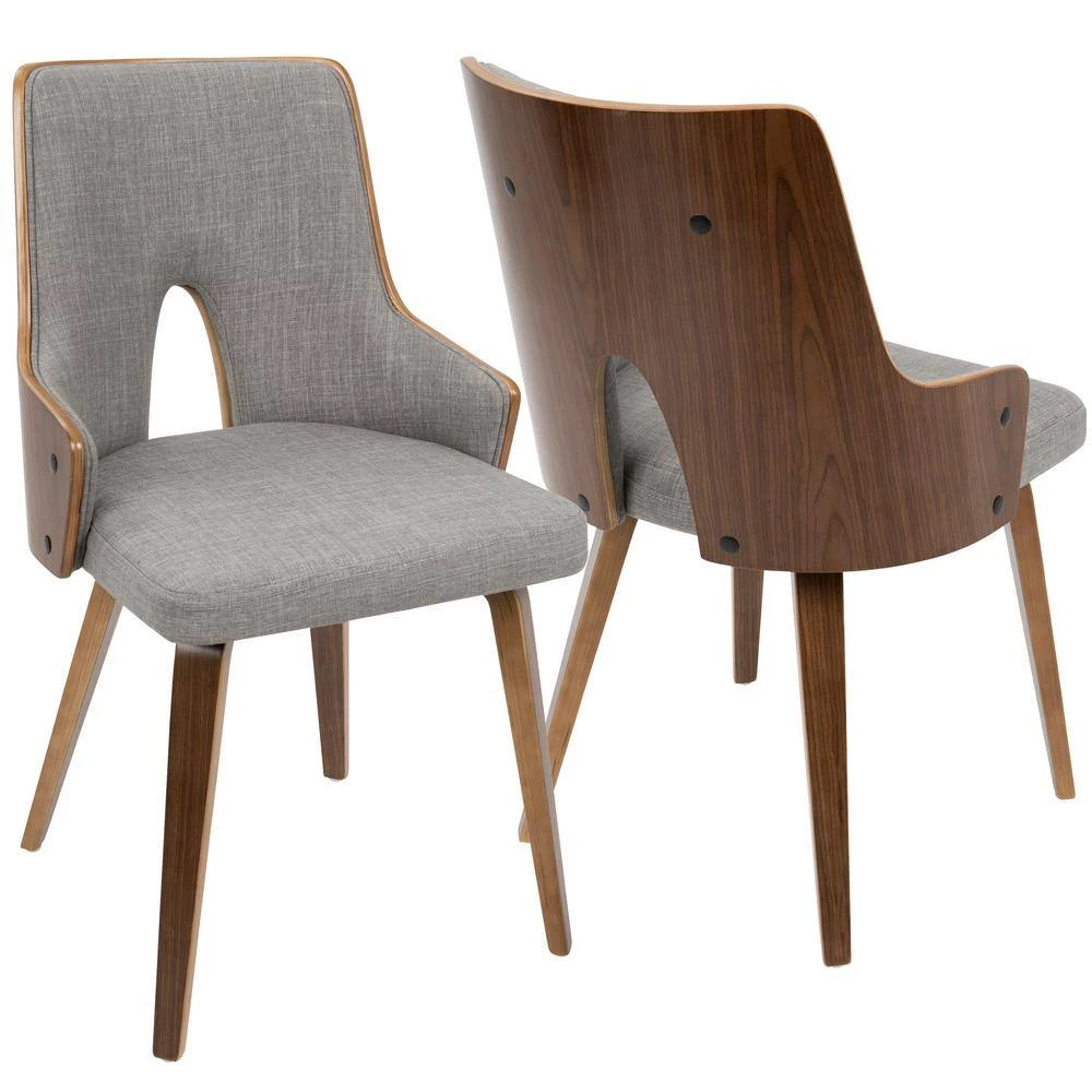 Enjoy the plush style and comfort of the Stella Chair. A padded backrest and seat are upholstered in woven fabric and Accented by walnut-finished bent wood back and legs. Choose from grey or green to Accent your home decor.
