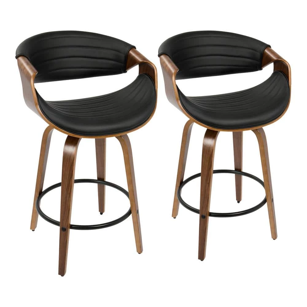 A curvaceous dose of Mid-Century style, the unique design, and silhouette of the Symphony Counter Stool will look great pulled up to any counter. Upholstered in a sleek faux leather accented with vertical tufting and walnut bent wood legs, the Symphony comes in a variety of colors to fit in any room. Includes two counter stools.